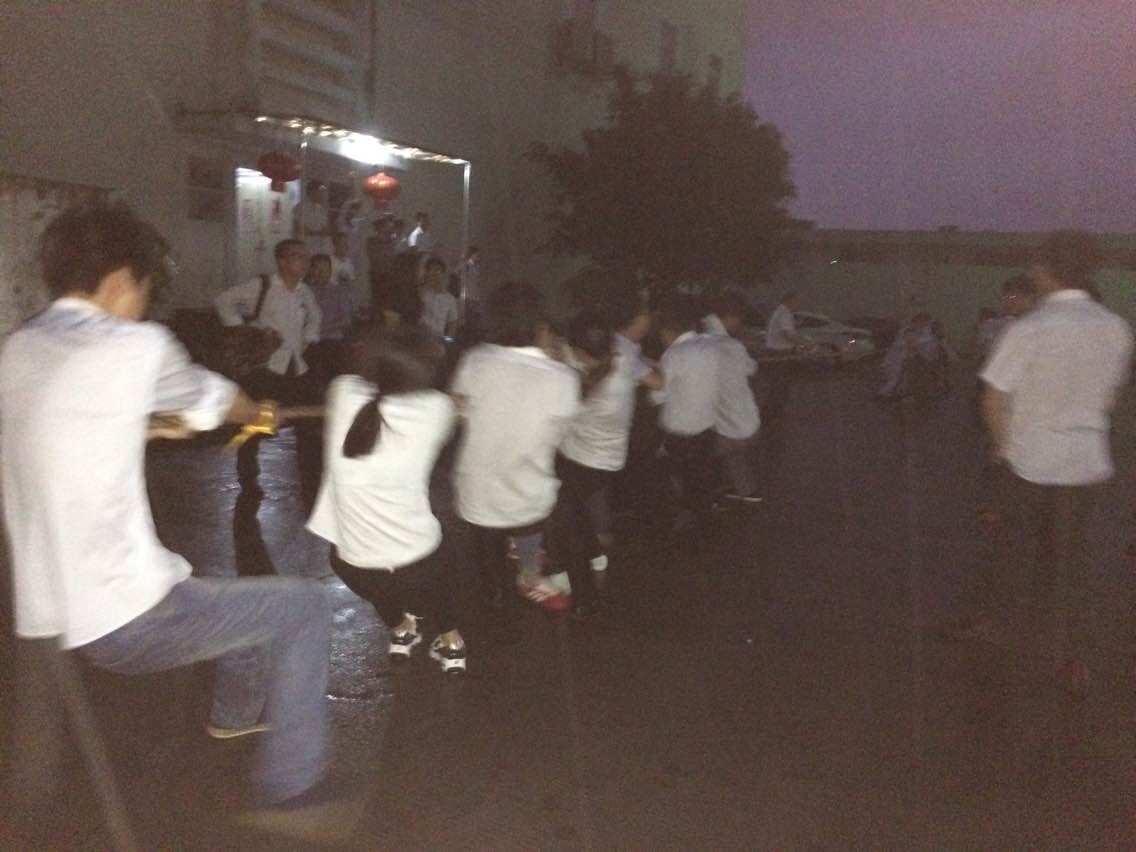 2015年4月7日公司舉行拔河比賽,上午還晴空萬里的天氣,下午卻天公不作美和之前風和日麗的景致截然相反突然下起了大雨,所有一直焦急的等待著雨停,一直到下午6.30分,雖然仍是陰雨飄落,且溫度降低且天已經黑了,在經過各隊長的商量后一致決定冒雨拔河。