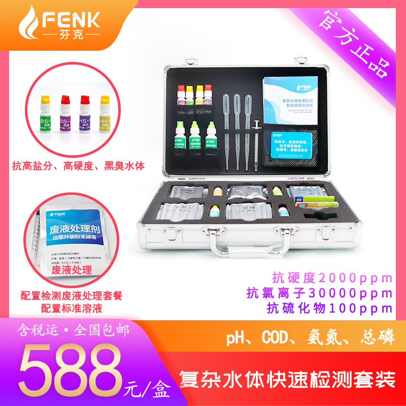 產品簡介: 芬克快檢專業應對復雜水體:抗高氯離子水(≤30000ppm)、高硬度水(≤2000ppm)、黑臭水(≤硫化物100ppm),提供快檢綜合解決方案。