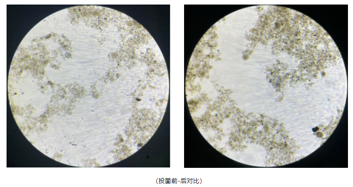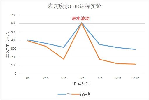 處理后效果:菌劑投加2日后出水降低,5日后出水COD穩(wěn)定達標,7天后穩(wěn)定在70mg/L以下,生化系統(tǒng)COD降解能力明顯好轉(zhuǎn)。